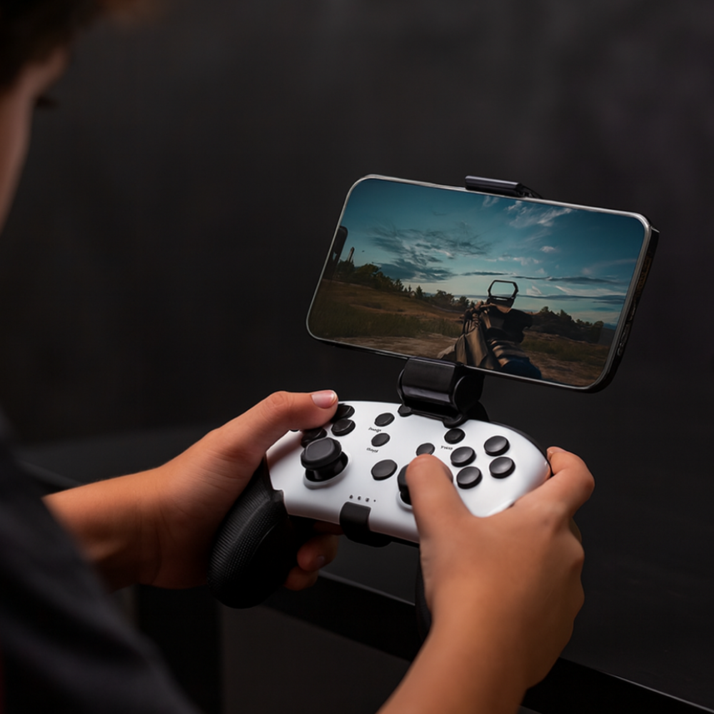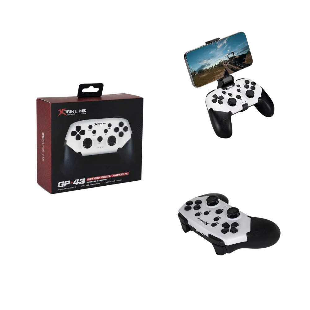 El control XtrikeMe GP-43 es un gamepad pensado para quienes quieren jugar con libertad. Puede utilizarse inalámbrico (Bluetooth) o conectado por cable Tipo-C, brindando flexibilidad para diferentes escenarios. Con su batería interna de 400 mAh, ofrece alrededor de 5 horas continuas de uso. Tiene hasta 20 botones configurables, lo que permite controles complejos en juegos exigentes. El diseño incluye un soporte desmontable para teléfono, ideal para gaming móvil.